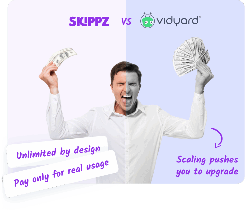Vidyard pricing is built around per-user costs and premium feature tiers. As teams grow, expenses rise quickly even if actual video usage stays the same.Skippz separates hosting from features. Your infrastructure costs remain naturally low, often up to 80 percent cheaper than Vidyard, while your Skippz plan stays focused on tools rather than usage inflation.